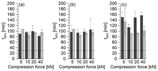 T80% values of tablets without MCC 200. Dark gray bars: ASD directly after preparation; light gray bars: PM directly after preparation. (a) ASD/PM VA30 tablets, (b) ASD/PM VA40 tablets, (c) ASD/PM VA50 tablets, average ± SD, n = 2.