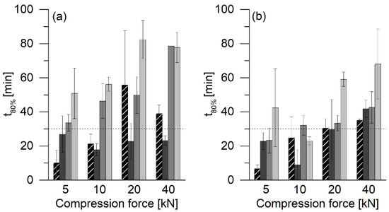 T80% values of tablets with MCC 200 compressed at a dwell time of 1 s. Black-striped bars: ASD directly after preparation; dark gray bars: PM directly after preparation; gray bars: ASD after six months of storage at 23 °C/75% RH; light gray bars: ASD after six months of storage at 40 °C/75% RH. (a) ASD/PM VA30 tablets, (b) ASD/PM VA40 tablets, average ± SD, n = 2.