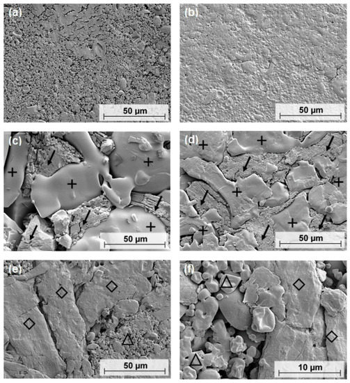 Scanning electron microscope (SEM) images of different tablets: (a) surface of pure ASD VA30 tablet, compressed at 5 kN; (b) surface of pure ASD VA30 tablet, compressed at 40 kN; (c) surface of pure PM VA30 tablet, compressed at 5 kN; arrows indicate PCM and crosses indicate PVP/VA; (d) surface of pure PM VA30 tablet, compressed at 40 kN; arrows indicate PCM and crosses indicate PVP/VA; (e,f) surface of ASD VA30 tablet with MCC 200, compressed at 10 kN; triangles indicate ASD VA30 and rhombuses indicate MCC 200.