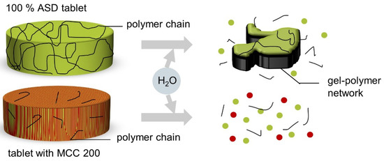 Illustration of the formation of a gel–polymer network in ASD tablets without MCC 200 and in comparison to tablets with MCC 200. Modified from Demuth et al. [5].