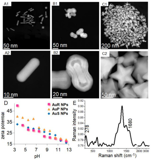 Au NPs with different shapes and sizes of the Au NPs, depending on the synthetic methods used, were prepared. Nanoparticles with rod-like (Figure 1(A1,A2)), peanut-like (Figure 1(B1,B2)), and star-like (Figure 1(C1,C2)) shapes were obtained. However, 20% of non-rod-shaped nanoparticles and 40% of non-peanut-shaped nanoparticles were recognized. Additionally, among the rod-shape AuR NPs, rounded ends were observed along with spherical Au NPs. Sizes, measured on the longitudinal and transverse axes in AuP NPs and AuR NPs, were used to compare NPs. In the case of AuR NPs, the sizes of the axes were 45 ± 8 nm and 10 ± 3, respectively, while, in the case of the AuP NPs, the sizes were 55–65 nm and 24–34 nm, respectively. The size of AuS NPs was 243 nm. Zeta potential plots of AuR NPs, AuP NPs, and AuS NPs (Figure 1D) showed that all of the gold nanoparticles were positively charged in the entire range of pH. For AuR NPs, the zeta potential values were 49 mV for pH 3.5 to 18 mV for pH 12.5, while for AuP NPs, these values were between 42 mV and 19 mV, and for AuS NPs, the zeta potentials were from 33 mV to 16 mV. For all of these nanoparticles, the potential value decreased as the pH value increased.