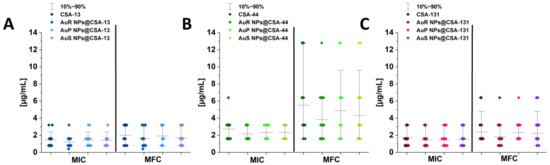 MIC (minimal inhibitory concentration; µg/mL) and MFC (minimal fungicidal concentration; µg/mL) values of CSA-13, AuR NPs@CSA-13, AuP NPs@CSA-13, AuS NPs@CSA-13 (A); CSA-44, AuR NPs@CSA-44, AuP NPs@CSA-44, AuS NPs@CSA-44 (B); and CSA-131, AuR NPs@CSA-131, AuP NPs@CSA-131, AuS NPs@CSA-131 (C) against 19 fungal clinical strains and 2 reference fungal strains.