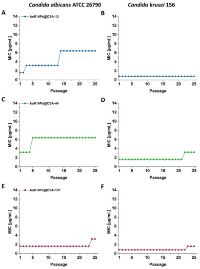 With regard to C. krusei 156, the initial MICs of AuR NPs@CSA-13, AuR NPs@CSA-44, and AuR NPs@CSA-131 were 0.8 μg/mL, 1.6 μg/mL, and 0.8 μg/mL, respectively. Notably, no change of MIC of AuR NPs@CSA-13 was observed until the end of the experiment (Figure 3B). In the case of AuR NPs@CSA-44 and AuR NPs@CSA-131, the MIC increased two-fold after 21 or 22 passages, respectively (Figure 3D,F). Moreover, no substantial changes through the rest of the experiment were observed.