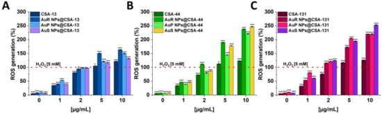 Generation of reactive oxygen species in AuP NPs@CSA-13, AuP NPs@CSA-44, and AuP NPs@CSA-131 -treated Candida cells. Increase in dichlorofluorescin diacetate–derived fluorescence signal after 1 h of treatment of C. albicans 1408 isolate with tested compounds in concentrations ranging from 1 to 10 μg/mL.