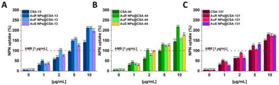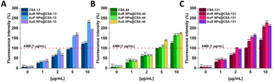 The increase of the membrane permeability of C. albicans 1408 subjected to CSA-13, AuR NPs@CSA-13, AuP NPs@CSA-13, AuS NPs@CSA-13 (A); CSA-44, AuR NPs@CSA-44, AuP NPs@CSA-44, AuS NPs@CSA-44 (B); and CSA-131, AuR NPs@CSA-131, AuP NPs@CSA-131, AuS NPs@CSA-131 (C) at doses of 1–10 μg/mL was investigated using the fluorimetric method. The dashed line corresponds to the effect obtained with the amphotericin B at a concentration of 1 μg/mL. The results show the mean ± SD, n = 3; * indicates statistical significance at ≤0.05, ** ≤0.01, and *** ≤0.001.