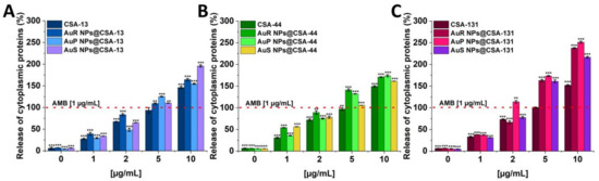 To verify whether the treatment of C. albicans with ceragenins and ceragenins attachment to Au NPs leads to the release of the protein content, a protein leakage assay was performed. The results shown in Figure 8 (panels A–C) indicate a significant release of cytoplasmic proteins as a consequence of the damage to the fungal membrane. The results obtained were reported for all of the synthesized nanosystems in a dose-dependent manner. It is worth noting that in case of AuP NPs@CSA-131 the greatest leakage of intracellular content was detected with 2.51-fold increase in comparison to the 1 μg/mL concentration of the amphotericin B. With ceragenins, substantially lower absorbance values were determined in relation to the nanosystems.