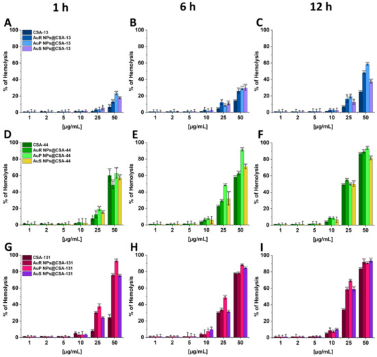 Hemoglobin release from human red blood cells (RBCs) incubated in the presence of CSA-13; AuR-NPs, AuP-NPs, and AuS-NPs containing CSA-13 (A–C); CSA-44; AuR-NPs, AuP-NPs, and AuS-NPs containing CSA-44 (D–F); and CSA-131; AuR-NPs, AuP-NPs, and AuS-NPs containing CSA-131 (G–I) at doses of 1–50 μg/mL after 1 h (A,D,G), 6 h (B,E,H), and 12 h (C,F,I) of incubation. Results show the mean ± SD, n = 3; * indicates statistical significance at ≤0.05, ** ≤0.01, and *** ≤0.001.