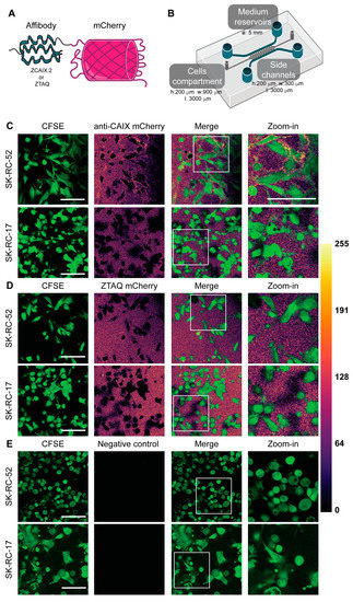 Affibody-mediated CAIX targeting on-chip. (A) Schematic representation of an affibody fused to mCherry. (B) Schematic representation of the microfluidic chip. (C,D) Confocal microscopy images of a tumor-on-a-chip after a one-hour incubation of CAIX-positive SK-RC-52 (C) or CAIX-negative SKRC-17 cells (D) with the anti-CAIX affibody-mCherry fusion or the ZTAQ affibody-mCherry fusion, which was used as non-binding control. (E) Medium only was used as a negative control to determine background fluorescence. The mpl-inferno LUT was used to depict the intensity in the mCherry channel. Scale bars represent 100 µm. CFSE, carboxyfluorescein succinimidyl ester.