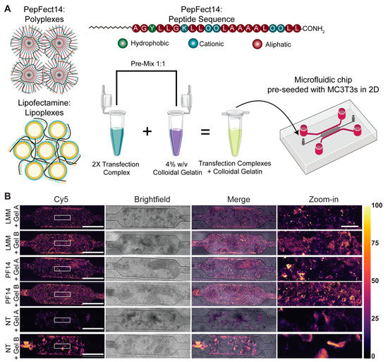 Uptake of mRNA transfection complexes in the presence of colloidal gelatin. (A) Schematic overview of mRNA transfections in the presence of colloidal gelatin within a microfluidic chip. PF14 forms micelles due to its stearyl moiety, and due to its positive charge, it electrostatically complexes mRNA into polyplexes. LMM lipoplexes are pre-formed lipid micelles that complex mRNA via their cationic lipid head groups. Image not drawn to scale. (B) Confocal microscopy images of uptake into MC3T3 cells two hours post-transfection, where the Cy5-label of Cy5-eGFP mRNA is visualized. For enhanced clarity, an enlarged region of interest, which corresponds to the white rectangle (width: 736 µm, height: 209 µm) in the leftmost column, is shown in the rightmost column. The untreated conditions were used as negative controls to assess the autofluorescence of colloidal gelatin. The mpl-inferno LUT depicts the Cy5 intensity, and all Cy5 images were calibrated equally across conditions. Scale bars represent 1000 µm; scale bars in zoom-in panels represent 150 µm. Cy5, Cyanine5; NT, non-treated.