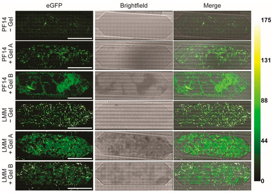 After validating mRNA uptake in the presence of colloidal gelatin NPs, the resulting eGFP expression was investigated. Importantly, we used an unlabeled eGFP mRNA for the expression analysis, which is expressed approximately five-fold more efficiently than its Cy5-labelled equivalent [20]. As expected, there were considerable differences in transfection efficiencies between the peptide-based PF14 and lipid-based LMM transfection complexes (Figure 3). We have previously demonstrated a 1–2 order of magnitude enhanced transfection efficiency of LMM compared to PF14 in 2D mRNA transfections [22]. Once again, Gel B produced more autofluorescence than Gel A (Figure S4). In the absence of colloidal gelatin, both LMM and PF14 showed abundant eGFP expression, although PF14 did so to a lesser extent. Unfortunately, in the presence of colloidal gelatin, the eGFP fluorescence was similar to autofluorescence for the PF14 conditions characterized by reduced eGFP expression. For LMM, reduced transfection efficiency was observed in the presence of colloidal gelatin. However, mRNA transfection of LMM co-formulated with Gel A or Gel B still showed widespread eGFP expression, which was well above autofluorescence and clearly represented the outlines of MC3T3 cells. Collectively, these results demonstrate the suitability of our microfluidic platform to simply and cost-effectively assess the influence of colloidal biomaterials on mRNA transfections.