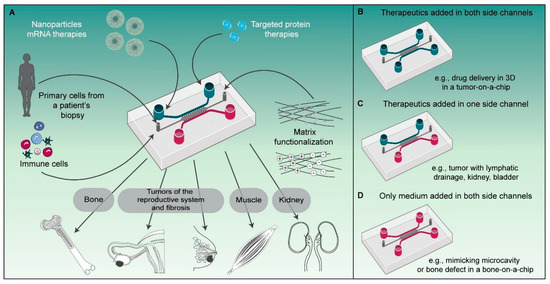 Schematic representation of the versatility of our microfluidic platform to study protein therapies and nanomedicines in various organ-on-a-chip systems. (A) Schematic with different parameters that can be included or modified in the microfluidic platform to mimic organ physiology and drug delivery. (B) Schematic of a microfluidic chip with drug delivery from both side channels as in the tumor-on-a-chip implementation utilized in this study to deliver anti-CAIX affibodies to tumor cells. (C) Alternative use of the microfluidic platform for mimicking the physiology of compartmentalized organ substructures from the kidney or bladder or the lymphatic drainage present in some tumors. (D) Schematic of the microfluidic chip with addition of only medium in the side channels, as studied in this paper, to mimic a bone-on-a-chip.
