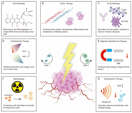 Combination of photodynamic therapy with various therapeutic regimens and possible synergistic antitumor mechanisms. (A) Chemotherapy, (B) Gene therapy, (C) Immunotherapy, (D) Photothermal therapy, (E) Hyperthemia therapy/Magnetic hyperthermia therapy, (F) Radiotherapy, and (G) Sonodynamic therapy.