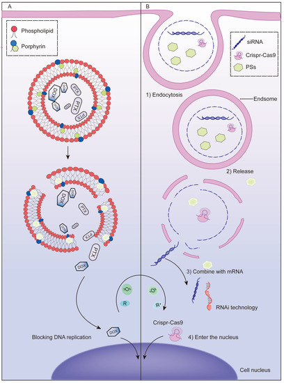 The rapid development of nanodelivery systems has improved the penetration ability of cells and tissues and stability of exogenous genes under physiological conditions, allowing gene therapy technology to break through previous bottlenecks and enable clinical application [102,103]. The combination of gene therapy and PDT offers a high degree of precision based on complementary base pairs, which most other therapeutic combinations lack. Exogenous genes are required to efficiently enter cells and successfully escape intracellular bodies before they can play a therapeutic role, which poses great challenges to the material properties of delivery vectors [104]. Programmable vectors have been proposed to solve this problem to some extent and are commonly released under internal stimuli such as enzymes under special pH conditions. Photochemical internalization (PCI) is an intracellular delivery technique using an exogenous light as a stimulus. After activation of PS, ROS can be rapidly produced within a short time to destroy the membrane of the intracellular body and release therapeutic agents such as nucleic acid drugs in the cytoplasm [105,106] (Figure 2B). This external light-dependent regulation is more controllable and stable than the internal response-dependent system and can achieve higher spatially controlled and targeted gene delivery [107]. Another type of photoprogrammed gene regulation uses PDT active nanomaterials as gene delivery vectors, such as PPBP, the black phosphorus (BP) nanosheets prepared with PEG and PEI modification, a black scale nanomaterial that shows PDT activity under light and then specifically degrades to release siRNA in a high ROS and acidic tumor environment to achieve targeted delivery [108].