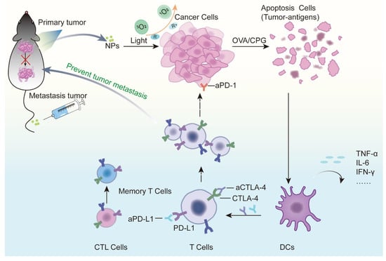Mechanism by which photodynamic therapy and immunotherapy synergistically enhance antitumor effects. When photosensitizers in tumor sites are activated, they can cause acute inflammation and induce cell apoptosis or necrosis. Dendritic cells mature when stimulated by cytokines released at the site of inflammation and provide antigens to T lymphocytes in regional lymph nodes. Activated T lymphocytes become effector T cells, which are attracted to chemokines, migrate to the tumor and kill tumor cells. Different types of immunotherapy drugs play a role in different steps of the complete antitumor immune cycle. Codelivery of a photosensitizer with an immune adjuvant or tumor antigen can synergistically enhance the activation of the host immune system and improve the immunosuppressive microenvironment. The codelivery of a photosensitizer with CTLA-4 and PD-L1 monoclonal antibodies can enhance the antitumor immunity effect of T cells. The activation of these immune cells also plays a role in preventing metastasis and recurrence.