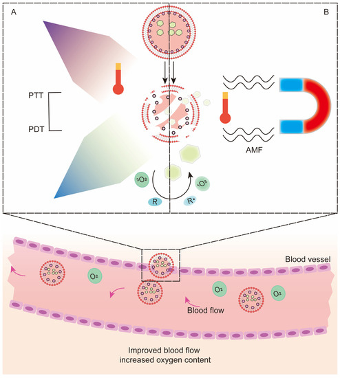 Additionally, as a minimally invasive treatment, PTT has certain similarities with PDT. Photothermal agents concentrated at the tumor site absorb laser radiation energy and convert light energy into hyperthermia, resulting in the thermal ablation of adjacent cells. PTT enhances the effect of PDT, mainly by improving blood flow and increasing oxygen content in tumors [146] (Figure 4A).