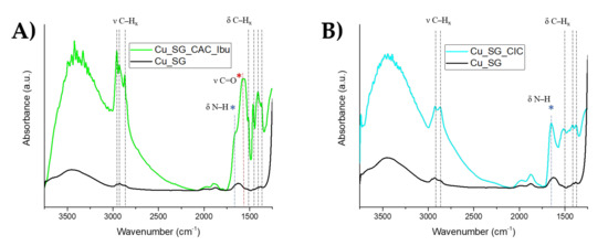 3.1. Morphological, Structural, and Chemical Characterization of Cu_SG_CAC_Ibu