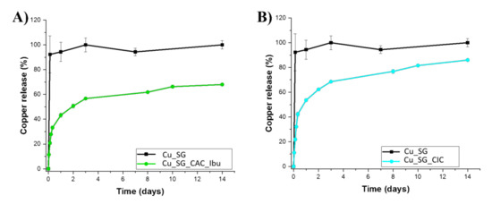 3.3. Copper Release from Cu_SG_CAC_Ibu and Cu_SD_CAC_Ibu