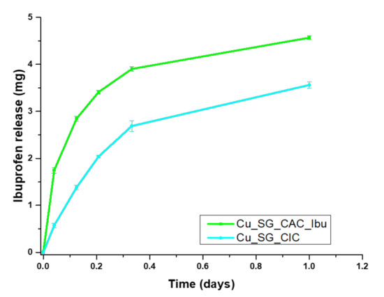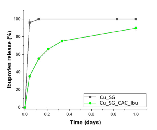 3.4. Ibuprofen Release from Cu_SG_CAC_Ibu and Cu_SG_CIC