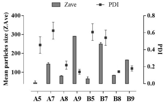 Mean particle size (Z-Ave, (nm)) and polydispersity index (PDI, (a.u.)) of SLN prepared with different amounts of Softisan (A5, A7, A8, and A9) or Suppocire (B5, B7, B8, and B9). Each measurement represents the mean value ± standard deviation (SD), n = 6.