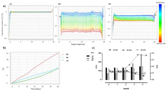 (a) Transmission profiles (ΔT) of SLN A8, B8 and B9 stored in Turbiscan® for 30 days at 25.0 ± 1.0 °C. Data are reported as a function of time in the range 0–30 days of sample height (0 to 20 mm); (b) Destabilisation kinetics in terms of evolution of Turbiscan® Stability Index (TSI) of samples stored in the instrument at 25.0 ± 1.0 °C for 30 days; (c) Mean particle size (Z-Ave, [nm]) and polydispersity index (PDI, [a.u.]) of SLN A8, B8 and B9 stored in Turbiscan® and measured by PCS after 1, 2, 3 and 4 weeks. Each measurement represents the mean value ± standard deviation (SD), n = 6.
