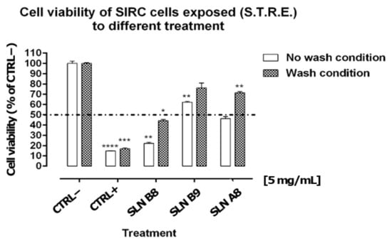 Cell viability of SIRC cells repeatedly exposed (6×) for 10 min with or without wash and with a step of 1.5 h between the repeated exposures (Short Time Repeated Exposure (S.T.R.E.)) to control formulations or delivery systems SLN B8, SLN B9, and SLN A8 diluted at 5 mg/mL. Dotted line is placed at 50% representing the cut-off value to determine cytotoxicity potential according to ECVAM protocol DB-ALM n° 17. Data represent the mean ± s.e.m. of three replicates for each condition. * p ≤ 0.05; ** p ≤ 0.01; *** p ≤ 0.001; **** p ≤ 0.0001. One sample t-test vs. cut-off 50%.