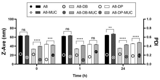 Nanoparticles mean size (Z-Ave, bars) and PDI (symbols) before (A8, A8-DB, A8-DP) and after (A8-MUC; A8-DB-MUC; A8-DP-MUC) 1 and 24 h of incubation with mucin at 35 °C. Significance was set as p > 0.05; ** p ≤ 0.01; *** p ≤ 0.001; **** p ≤ 0.0001; ns—not significant.