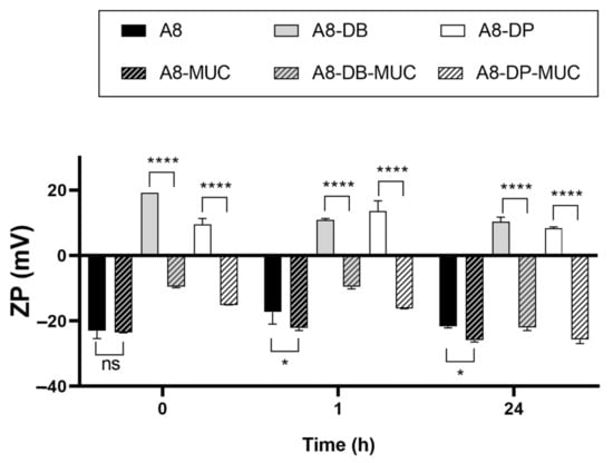 Nanoparticles zeta potential (ZP) before (A8, A8-DB, A8-DP) and after (A8-MUC; A8-DB-MUC; A8-DP-MUC) 1 and 24 h of incubation with mucin at 35 °C. Significance was set as p > 0.05; * p ≤ 0.05; **** p ≤ 0.0001; ns—not significant.