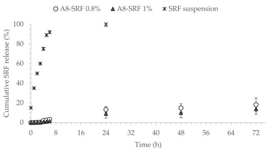 In vitro release profiles of Sorafenib (SRF) from SLN A8 loaded with 0.8% or 1.0% w/v, compared to free drug suspension 1%, w/v (mean ± SD, n = 3).