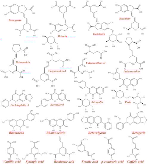 Beta vulgaris is an edible plant with numerous health benefits due to the presence of various essential biomolecules such as phenolics, carotenoids, minerals, vitamins, ascorbic acids and betalians (betacyanin-red violet pigment and betaxanthin-yellow orange pigment) [40]. The water-soluble pigments betalians (betacyanin and betaxanthin) are commercially anticipated as non-toxic, non-carcinogenic and non-poisonous food dyes [40]. Beta vulgaris contains highly active pigments, betalains, scorbic acid, carotenoids, polyphenols, flavonoids, saponins and high levels of nitrate. Most common bioactive phytochemicals identified in the Beta vulgaris are shown in Figure 1 [41,42,43]. In addition, betalains are rich nitrogenous pigments with heterocyclic rings providing colors to plant parts such as those of chlorophylls, carotenoids, anthocyanins, and other flavonoids [44]. The Beta vulgaris polyphenols and carotenoids have antioxidant, anti-inflammatory, anticarcinogenic, antidiabetic, wound healing properties, cardiovascular disease-depressing properties, hepato-protective activities, and hypertensive healing support [45,46,47].