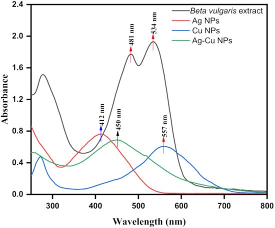 UV–Vis spectra after the measurement of optical properties were inferred for the biosynthesis of Ag-Cu nanoalloy from Beta vulgaris L. extract, as shown in Figure 3. Beta vulgaris L. extract is a mixture of several phytochemicals and pigments that showed characteristic absorption peaks intensities at λmax ca. 481 nm and ca. 534 nm corresponding to yellow betaxanthin and red-purple betanin, respectively, [53,54]. Meanwhile, an absorption intensity peak at ca. 412 nm was observed from Ag NPs, and Cu NPs showed characteristic peak intensity at ca. 557 nm. The observed local surface plasmon resonance (LSPR) showed the effect of Cu fabrication onto surface of Ag NPs in biosynthesized Ag-Cu nanoalloy as reflected from the absorption peaks observed in UV–Visible spectroscopy. This fact can be viewed after their redox potentials, as the higher redox potential of Ag+ to Ag (0.799 V) compared with Cu2+ to Cu (0.34 V) emphasizes the Cu particles are not possible formed before the reduction of all Ag+ in the reaction mixture [55]. We observed a lower shift of peak at λmax ca. 481 nm and peak at λmax ca. 557 nm of Beta vulgaris extract and Cu NPs, respectively. Also, the higher shift of peak at λmax ca. 412 nm of Ag NPs accentuates Ag-Cu nanoalloy’s biosynthesis as inferred from peak intensity at λmax ca. 450 nm. However, the obtained results of the spectrum emphasized the biosynthesis of Cu nanoparticles onto the surface of Ag nanoparticles and was enhanced during the one-pot biosynthesis Ag-Cu nanoalloy from Beta vulgaris extract with alternate blue and redshift in the absorption band.