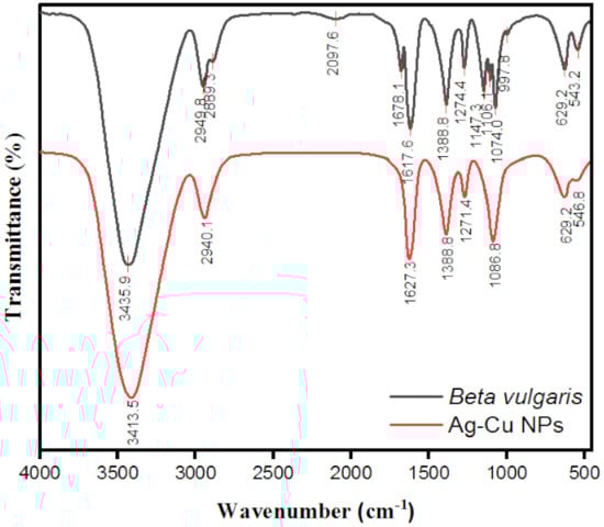 Fourier transforms infrared (FTIR) spectra of Beta vulgaris extract and Ag-Cu bimetallic nanoparticles.