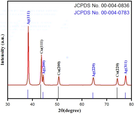 The X-ray diffraction (XRD) patterns of biosynthesized Ag-Cu nanoalloy from Beta vulgaris L. extract were depicted in Figure 5. The occurrences of the diffraction pattern in bimetallic nanoparticles with sharp peaks deduce their crystalline structures [59]. In biosynthesized Ag-Cu nanoalloy, obtained diffraction peaks at angle 2θ with corresponding diffraction patterns emphasized Cu’s face-centered cubic (fcc) phase with Ag crystals. Additionally, from close perusal of Figure 5, the metallic silver (JCPD card No. 004-0783) was detected from recorded diffractions peaks at 38.5, 44.8, 64.7, and 77.5 with corresponding crystallographic planes (111), (200), (220) and (311), respectively, specifying the standard fcc structures of silver particles [60]. Moreover, the presence of Cu nanoparticles was deduced from the 2θ angle at 43.8, 50.4 and 73.6 with alternate crystallographic planes (111), (200), (220) and (311), respectively, from metallic Cu (JCPD card No. 00-004-0836) corresponding to the fcc planer phase of Cu nanoparticles with Ag nanoparticles in a bimetallic Ag-Cu nanoalloy [61]. However, the Scherrer equation was utilized to calculate the average crystalline size of biosynthesized Ag-Cu nanoparticles at intense peak at angle 2θ. Average crystalline size with highest size distribution was calculated as per Scherrer equation (d = Kλ/βcosθ) and was found 20.29 nm. The different parameters of Scherrer equation such d represent the crystallite size, K as Scherer constant equal to 0.9, λ to the wavelength of X-ray sources (typically 1.5406 Å), β relays on FWHM in radians, and θ signify the peak position (Bragg angle). Furthermore, the obtained crystalline size of nanoalloy was conformed from the SEM analysis and was found almost similar in numerical values.