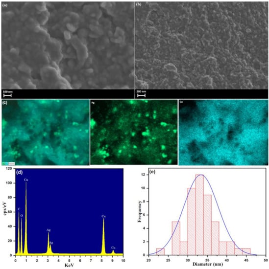 The SEM analysis was used to justify the obtained morphology and structure of biosynthesized Ag-Cu nanoalloy, as depicted in Figure 6a,b. The semi-spherical agglomerated bimetallic Ag-Cu clusters are prominently observed at 200 nm resolution in Figure 6a,b. However, under the high resolution of about 100 nm, bimetallic Ag-Cu nanoalloy retains a nanostructure of silver and copper in semispherical morphology and these nanoparticles are fused to each other, as illustrated in Figure 6a,b. For Ag-Cu nanoparticles, more detailed elemental mapping was carried out using higher magnification, as shown in Figure 6c. The Cu nanoparticles have a distinct predomination over the Ag nanoparticles, as shown in the picture. Considering the magnification used, all mappings of bimetallic samples show a regular spread of Ag and Cu. In addition, the EDX elemental analysis was performed to determine the elemental composition of the bimetallic Ag-Cu nanoalloy, as shown in Figure 6d. The EDX elemental detection also confirms the purity of the synthesized Ag-Cu nanoparticles. The observed Ag high-intensity peak compared to Cu correlates to the presence of crystalline structure in biosynthesized Ag-Cu nanoalloy. Besides, the biogenesis of Ag-Cu nanoalloy was realized from the lower eV positions of corresponding C and O atoms. Moreover, Figure 6e depicts the size distribution histogram of Ag-Cu NPs. The values for particle size are represented as the mean diameter (dmean) and image software was used to calculate an average particle size in bimetallic Ag-Cu nanoalloy of about 33 nm. Furthermore, the bimetallic Ag-Cu nanoalloy was characterized by TEM analysis at different magnification power, as shown in Figure 7a,b. The TEM micrographs of bimetallic Ag-Cu NPs show semispherical morphology with different sizes. These bimetallic Ag-Cu nanoparticles were found to be agglomerated and incorporated in a dense, thick pattern on the transmission electron microscopy pictures, suggesting that they may be serving as stabilizing chemical ingredients in the aqueous extract of Beta vulgaris.