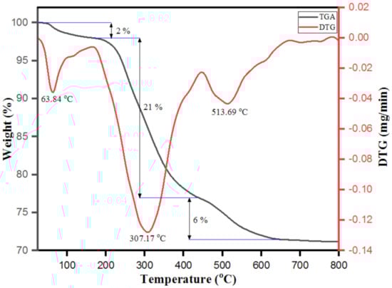 The TGA/DTG, thermal stability, and the thermal degradation patterns are analyzed to comprehend the role played by phytochemicals of Beta vulgaris L. extract as capping/stabilizing agents onto the surface of biosynthesized Ag-Cu nanoalloy, depicted in Figure 8. Thermogravimetric analysis of weight loss was operated under nitrogen atmosphere at a heating rate of 10 °C/min; the observed weight loss process was further explained in a stepwise manner from the TGA/DTG curves (Figure 8). The analyzed weight loss during the thermal decomposition observed from the degradation pattern of biosynthesized Ag-Cu nanoalloy was approximately 29% by weight. The close perusal of Figure 8 emphasizes that the regions of weight loss observed from the TGA analysis were in the ranges 0–270 °C, 270–410 °C, and 410–650 °C, respectively. The observed DTG peak at 63.84 °C in the region of TGA 0–270 °C (weight loss by 2%) was apparently from the loss of moisture content from the surroundings and the volatile phytochemicals adsorbed onto the surface of Ag-Cu nanoalloy. Additionally, the maximum weight loss in the TGA region 270–410 °C (about 21%) with DTG peak at 307.17 °C was believed from the thermal decomposition of biomolecules including coloring pigment such as betanin of Beta vulgaris L. extract, which acts as reducing agents during biosynthesis of bimetallic Ag-Cu nanoalloys. Moreover, the presence of other constituents, including phenolic acids, proteins, and flavonoids of Beta vulgaris L. extract as capping/stabilizing agents, were determined from the DTG peak at 513.69 °C in the region of TGA between 410–650 °C (with weight loss 6%). TGA/DTG curves obtained further approximate Beta vulgaris L. extract assisted biosynthesis of thermally stable Ag-Cu nanoalloy. However, in general, the thermally stable nanoparticles with a high ratio of surface area to volume possess an efficient capability to inhibit bacterial and fungal growth. Silver in its native metallic state is being inert while it gets ionized in contact with moisture. The ionized form of silver has been reported to be highly reactive in binding with bacterial cell walls, leading to denaturation of tissue proteins and structural changes with cell distortion and death [62]. Silver nanoparticles can deteriorate bacterial growth upon binding with DNA and RNA of bacterial cells with inhibition of bacterial replication [63,64]. Meanwhile, the Cu and CuO nanoparticles are reported to possess a broad spectrum of antimicrobial activities [65]. Based on the literature survey and keeping the inherent chemical properties of both mono-metals in mind, we assessed the development of Ag-Cu nanoalloy from Beta vulgaris L. extract and evaluated its applicability against the growth inhibition and virulence in C. albicans.