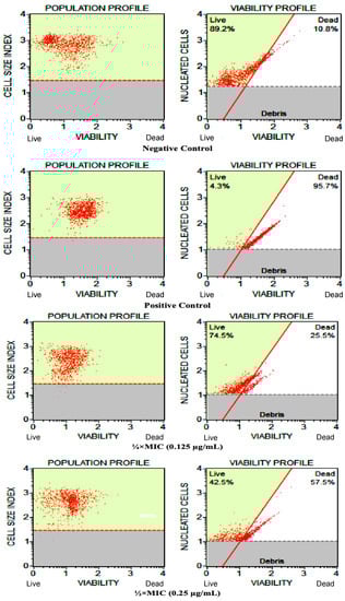 The effect of test NPs on the cell viability profile of C. albicans was tested at different concentrations (¼ × MIC and ½ × MIC), and the results are presented in Figure 9. Results indicated that the test NPs at sub-inhibitory concentrations considerably decrease the cellular viability compared to control cells. Post-analysis, it was observed that at ¼ × MIC value, there was 25.5% ± 2.7% cell death, while a significant increase in the percentage of cell death (57.5% ± 2.0%) was detected after the cells were exposed to ½ × MIC value. Unexposed and heat-killed cells were used as negative and positive controls, showing 10.8% ± 1% and 95.7% ± 2% dead cells, respectively. In the population profile square (Figure 9), debris was omitted from the cell population based on cell size index to maintain the assay’s accuracy and avoid false results. From the viability profiling of these nanoparticles, which reported the fungicidal activity of these bimetallic NPs, it can be concluded that these NPs could have targeted fungal cell membrane and thereby disrupt cellular integrity, which results in cell death. However, further studies are required to confirm these claims.