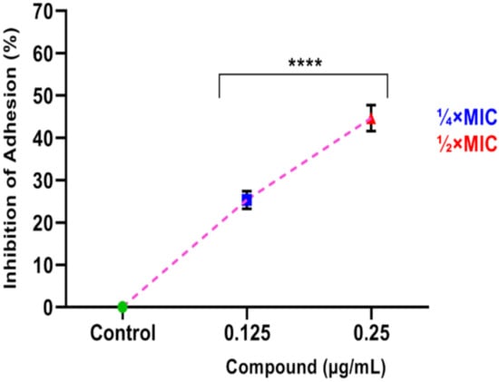 Effect of Ag-Cu bimetallic NPs on C. albicans adherence. Strain SC5314 cells were exposed to ¼ MIC and ½ MIC of the test NP. Untreated cells (Control) represent 0% inhibition of adherence whereas, the adherence was found hindered in exposed C. albicans cells. **** p value < 0.0001.