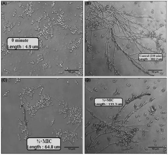 The effect of Ag-Cu bimetallic NPs on C. albicans morphogenesis (yeast to hyphae transition) was visualized microscopically. The results revealed that the testing of NP at its subinhibitory concentrations obstructs the morphological change in C. albicans, whereas the unexposed control group underwent a morphogenesis phenomenon (Figure 11). The percentage of yeast to hyphae transition and the length of the hyphal form (scale of 10) in both test and control at different time intervals are summarized in Table 2. When compared, control yeast cells displayed 52–55% yeast to hyphae transition in 120 min, whereas only 6–9% transition was observed at ¼ × MIC value followed by complete hyphal inhibition at ½ × MIC. Furthermore, unexposed control cells showed almost 100% transition in 210 min. However, in the presence of the NPs, the population showing transition was markedly reduced; only 46–50% and 18–21% hyphal transition were detected at ¼ × MIC and ½ × MIC, respectively. Additionally, cells treated with test NP also demonstrated a significant consequence on their hyphal length compared to control. Readings were also noted after 30, 60, and 90 min but not shown as the results were almost similar to those of 0 min.