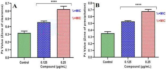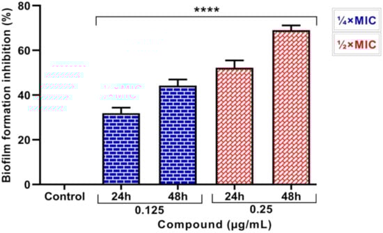 As morphological transition and adherence are directly linked to biofilm formation, the current study aimed to check the effects of newly synthesized bimetallic Ag-Cu NPs on biofilm formation. The results indicated that the test NPs significantly inhibit biofilm formation in C. albicans (Figure 12). At treatment of cells to ¼ × MIC, there was 31% ± 2% and 44% ± 1% inhibition in biofilm formation after 24 h and 48 h, respectively. These figures at ½ × MIC value of test NPs were 52% ± 1% and 69% ± 1% after 24 h and 48 h, respectively. Furthermore, the rate of inhibition in biofilm formation was directly dependent on time and concentration.