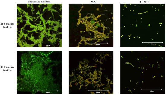 Inhibitory effect of Ag-Cu bimetallic NPs on mature C. albicans biofilms. The figure represents CLSM analysis of C. albicans SC5314 biofilms after exposure to test nanoparticles at various maturation phases (24 h and 48 h). The green fluoresces (Con A) represent the C. albicans cell wall and biofilm matrix; yellow-green fluoresces (FUN-1) represent dead/metabolically inactive cells.