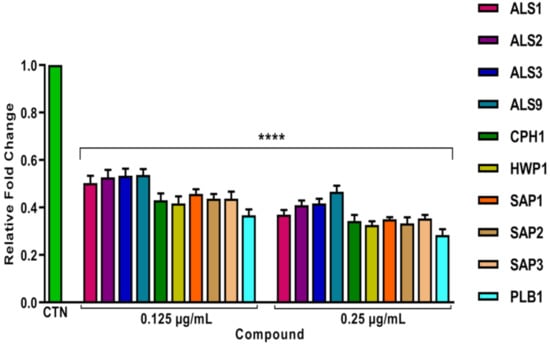 Real-time PCR was used to study the effect of bimetallic NPs on the virulence factor-related genes (Table S1, see Supplementary Materials) in C. albicans SC5314 as previously reported [37]. In brief, the total RNA extraction was undertaken using Quick–RNA Miniprep Kit (Zymo Research, Irvine, CA, USA) followed by cDNA synthesis using a iScriptTM cDNA synthesis kit (Bio-Rad, Hercules, CA, USA). Following cDNA synthesis, RT-qPCR was performed using Roche Real-time PCR system (Basel, Switzerland), and fold changes in expression were calculated using the formula 2−(ΔΔCt). Primer sequences, cycling conditions, and master mix for all the genes were adopted from previous study, and the forward and reverse primer sequences are reported as supplementary data (Table S1, see Supplementary Materials) [37].