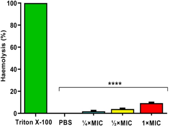 Haemolytic assay was performed on horse red-blood cells (National Health Laboratory Services, (NHLS), Johannesburg, South Africa) to evaluate the cytotoxic effect of Ag-Cu bimetallic NPs using previously reported method [37]. Recommended RBC suspension were treated ¼ × MIC, ½ × MIC and MIC of NP for 1 h at 37 °C. After incubation, samples were spinned for 10 min, and the absorbance of the supernatant was measured at 450 nm. 1% of Triton X-100 (Invitrogen, Thermo Fisher Scientific, Eugene, OR, USA) was used as a positive control, whereas PBS treated cells as a negative control. The following equation was applied to calculate the percentage of haemolysis: