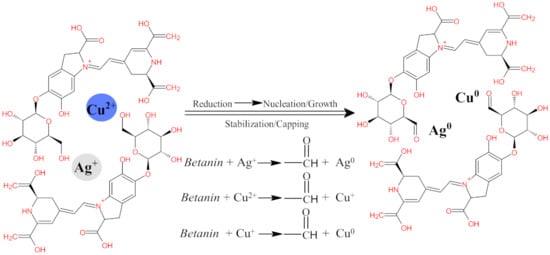 It is well established that the different plant parts including leaves, flowers, seeds, and fruits are rich in polyphenols, sugars, phenolic acids, alkaloids, proteins and terpenoids, which play a protuberant role in the bio-reduction of metal precursors into metal and metal oxide nanostructured materials. The one-pot biosynthesis method was developed for the synthesis of Ag-Cu bimetallic nanoparticles. Biosynthesis of nanoparticles can occur by the interaction of biomolecules of plant extract with metal precursors, which results in the bio-reduction of these precursors, in turn, resulting in the formation of stable nanoparticles, and the oxidization of biomolecules, simultaneously. The Ag0 and Cu0 were formed during the reduction of Ag+ and Cu2+ by glucose primary –OH group of betanin, as the primary -OH of glucose is very reactive as compared to the secondary –OH groups [51,52]. The mechanism of nanoparticle formation takes place in different steps, including reduction, nucleation/growth, and stabilization/capping, as shown in Scheme 1. The phytochemicals present in the extract play the role of bio-reducing agents as well as stabilizing agents. The standard reduction potential of Cu2+/Cu0 (+0.34 eV) is comparatively low as compared to the standard reduction potential of Ag+/Ag0 (0.78 eV). Consequently, the reduction of Ag+ occurs more rapidly than that of Cu2+ when mixtures of AgNO3 and Cu(NO2)2 were reduced by phytochemicals present in the aqueous extract of Beta vulgaris. However, it was observed that the bio-reduction of Cu2+ to Cu0 was enhanced due to the presence of silver ions (Ag+), resulting in the formation of Ag-Cu alloy nanoparticles. Therefore, it is concluded that the silver nanoparticle surface plays an essential role in the Cu2+ reduction enhancement. The increase in Cu2+ reduction in the presence of Ag particles is most likely due to the cathodic polarization of Ag-rich Ag/Cu alloy nanoparticles.