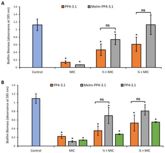 Biofilm biomass formed by MDR clinical isolates of (A) S. aureus (SA007) and (B) K. pneumoniae (KP010), in the presence of PP4-3.1, MeIm-PP4-3.1 and the noncovalent equimolar mixture PP4:3.1. The test peptides were added to culture medium (TSB) at MIC, ½ × MIC and ¼ × MIC (with reference to MIC values obtained in TSB, see text). Control biofilms were grown in the absence of peptide. Data are representative of two independent experiments performed in triplicate. The error bars represent the standard deviation (SD). ns: not significant; Statistically significant differences between biofilms formed in the presence of the peptides and respective control biofilms without peptide (p < 0.05) are marked with an asterisk (∗).