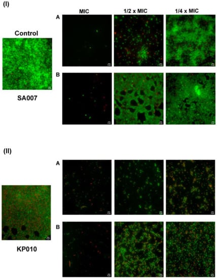 Fluorescence microscopy representative images of biofilms formed by MDR clinical isolates (I) S. aureus SA007, and (II) K. pneumoniae KP010, in the absence (control) or in presence of the test peptides (A) PP4-3.1 and (B) MeIm-PP4-3.1, at MIC, ½ × MIC and ¼ × MIC. The Live/Dead™ BacLight™ Bacterial Viability staining kit was used, which stains in green (SYTO 9 fluorescence) live bacteria, and stains in red (propidium iodide) dead or dying bacteria (with a damaged membrane). Scale bar corresponds to 5 µm.