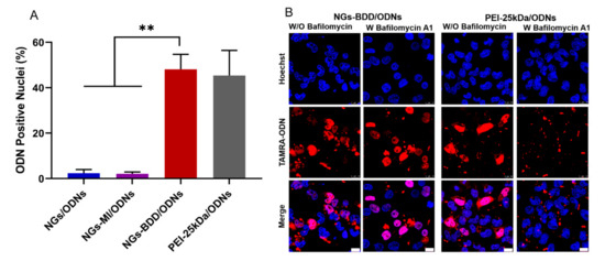 Endosomal escape of TAMRA-labeled ODNs (red) mediated by nanogels and PEI-25kDa in HEK293T cells. (A) Semi-quantitative analysis (% cells with ODN positive nuclei) of CLSM images. Data present mean ± SD of three independent experiments and 150–200 cells (9 images in total) per condition (** p < 0.005). (B) CLSM images of cells after incubation with NGs-BDD/ODNs and PEI-25kDa/ODNs for 4 h with or without Bafilomycin A1. The cell nuclei were stained with Hoechst33324 (blue). Scale bars are 10 μm.