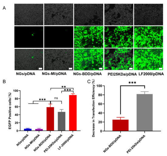 Transfection efficiency with nanogel/pDNA PEI/pDNA and LF2000/pDNA complexes in HEK293T cells. (A) Light microscopy images of nanogel-treated HEK293T cells (upper row: phase contrast; middle row: fluorescence; lower row: merged phase contrast and fluorescence. Scale bars indicate 100 μm). (B) Percentage of EGFP-positive cells measured by flow cytometry after treatment with complexes for 48 h. (C) Decrease in percentage of EGFP-positive cells after treatment with NG-BDD/pDNA complexes and PEI-25kDa/pDNA complexes in the presence of Bafilomycin A1 compared to treatment in the absence of Bafilomycin A1. Data present mean ± SD of three independent experiments performed in duplicate (** p < 0.005, *** p < 0.001).
