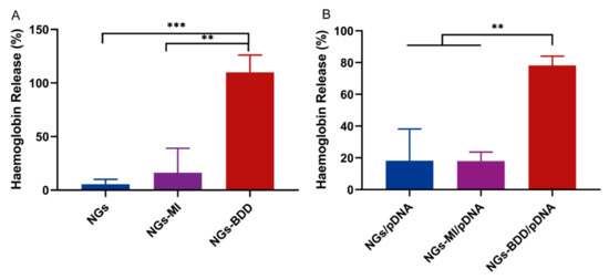 Membrane-perturbing activity of nanogels and their complexes with pDNA. Erythrocytes were incubated with (A) NG, NG-MI, and NG-BDD nanogels and (B) complexes, and hemoglobin release was measured by absorption spectroscopy. 100% hemoglobin release was induced with 1% Triton X-100 (n = 3, ** p < 0.005 *** p < 0.001).