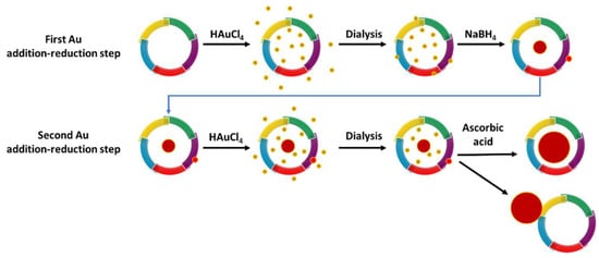 Recombinant human H-ferritin homopolymer (FTH) and L-ferritin homopolymer (FTL) were used as nanocontainers for the synthesis of AuNPs to obtain FTH-AuNP and FTL-AuNP, respectively, following a protocol with two successive gold addition–reduction steps based in a previous protocol published by Fan 2010 [] (Figure 1). Potentially, gold nanoparticle growth could occur in the outer or inner surface of the ferritin shell.