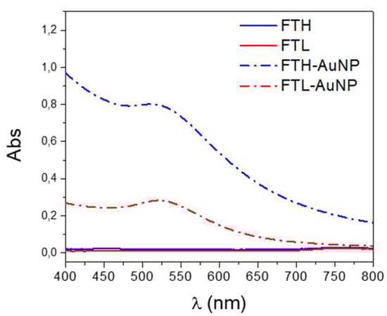 Ferritin-containing gold nanoparticles (FT-AuNPs) were characterized by UV-vis spectroscopy in the range of 400 to 800 nm to evaluate the characteristic surface resonance plasmon (SRP) absorbance peak of the AuNPs [] (Figure 2). The spectra of FT-AuNP samples exhibited the SRP absorbance peak at 511 and 520 nm in FTH and FTL, respectively. The slight shift observed between both AuNP-ferritin SRP peaks and the different absorbance intensities between FTH and FTL reflect not only differences in the metallic core size distribution of the gold nanoparticles [] but also the effect of the dielectric constant of the nanoparticle environment in each homopolymer, which is different due to the specific amino acid composition interacting with the AuNP surface.