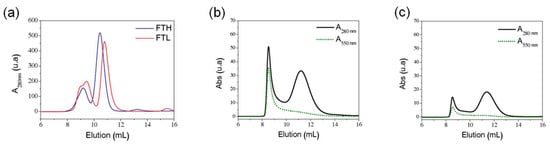 Size exclusion chromatography of FTL and FTH samples. Elution profile of (a) ApoFTH and ApoFTL, (b) FTH-AuNP and (c) FTL-AuNP.